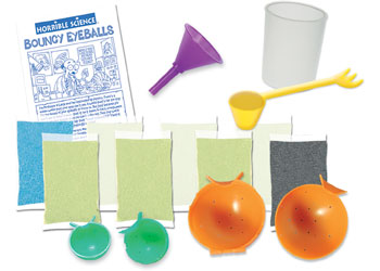 Make eyeballs that bounce, find out how balls bounce and learn jazzy juggling. Make one large eyeball and three small glow-in-the dark eyeballs. Contents: 8 packs of crystals, large mould, small mould, plastic pot, funnel, measuring spoon and "Horrible Info" leaflet Suitable from 8 yrs+