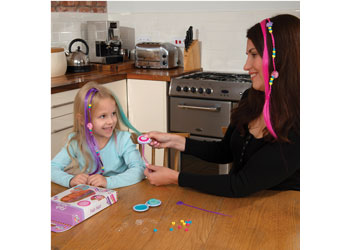 Make and wear fashionable Make and wear fashionable hair extensions and add colour with hair chalks! Plait the coloured hair extensions and thread on beads and flowers with the beading wand. Simply close the hair chalk compact around the hair, press the centre and move down. Contents: 2 hair chalk compacts, 2 coloured hair extensions, 30 heart beads, 4 fabric flowers with beads, beading wand, 20 elastic bands and guide. Suitable from ages 6 yrs+