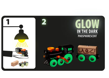 All aboard... if you dare! The BRIO Ghost Train glows eerily in the dark as it creeps along the tracks, bringing a touch of spooky fun to BRIO World. This ghostly steam engine features glow-in-the-dark wheels and haunting details, while a mysterious wooden casket follows behind in its wagon. Perfect for imaginative storytelling and eerie nighttime play, it connects easily to other BRIO vehicles with classic magnetic couplings.