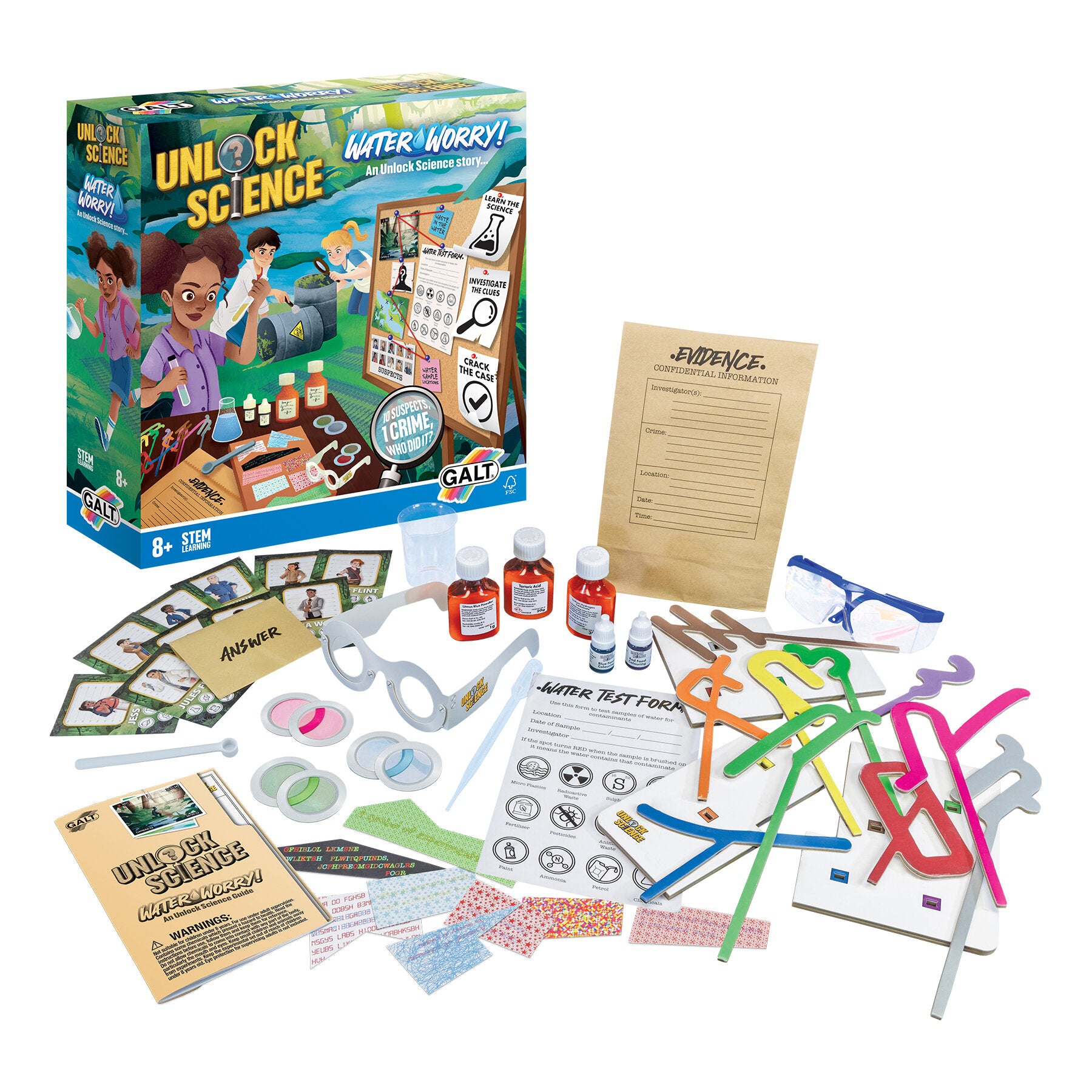 Waste chemicals have been illegally dumped in the river! Can you help us to solve this crime? Our science detectives have found evidence and clues. We need your help - learn the science, complete the experiments, solve the clues and eliminate the 10 suspects to crack the case!