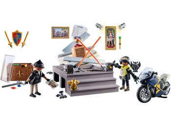 Even during the pre-Christmas season, crime does not rest. In the museum theft, burglars try to capture high-value exhibits. Over the 24 days leading up to Christmas, a diorama is created with the burglary scenario. The platform "collapses" at the push of a button. Includes police motorcycle.