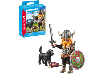 PLAYMOBIL Special Plus Viking Warrior with shield, sword, and axe. The Viking is accompanied by his loyal guard dog, who is rewarded with a delicious meat bone.