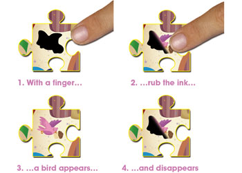 The Fairy Palace 50-piece puzzle has 15 rub-and-reveal patches. Children will enjoy making these puzzles with fun scenes,then rubbing the patches of heat sensitive ink to discover what is hidden underneath.The hidden pictures will appear and then disappear.Size of puzzles: 40 x 55cm