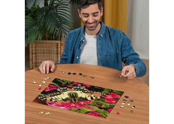 Experience the delicate beauty of nature with this 500-piece jigsaw puzzle featuring a butterfly perched on pink flowers. This enchanting puzzle captures a serene moment where a vibrant butterfly, with its intricate wing patterns and vivid colours, rests gracefully on a cluster of blooming pink flowers. The soft hues of the petals and the detailed design of the butterfly create a harmonious and captivating scene.