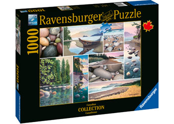 Relax into your personal puzzle nirvana with the quiet calm of this lovely collage! Illustrations of Canada's west coast highlight nature scenes ranging from breaking ocean waves to peaceful inlets and coves. The pastel palette extends to the rocks, smoothed by centuries of waves tumbling away rough edges. The sleek lines of the canoe are a result of steaming the hull to widen it. Part of our Canadian Collection series - a tranquil puzzle sure to bring you hours of stress-reducing enjoyment!