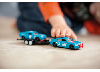 Racing set with 8-cylinder powerWhat a combination! What paintwork! On the car trailer, the Dodge Charger pulls the Dodge Challenger SRT Racing to the next track test. The trailer is slowly tilted backwards, and the sky-blue V8 monster rolls backwards. Door open, final instructions to the driver. Starting number 42 is cleared to start the warm-up. The car roars out of the pit lane onto the course. The rubberised wheels on the sporting rims are warmed to running temperature, and then: Foot to the floor and release 700 HP. Vroom!