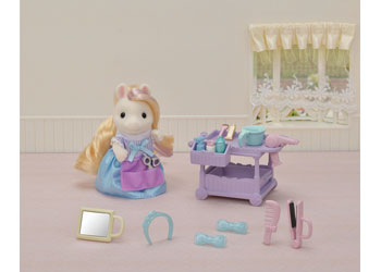 Bring creativity and style to Sylvanian Village with the Sylvanian Families Hair Stylist Set. This elegant set features Serafina Manely, the talented Pony hairdresser with silky hair, along with her salon cart and an array of professional accessories. Children can style, brush, and create beautiful hair looks using the included combs, scissors, clips, and styling products. The bottles and tools fit neatly onto the salon cart, while Serafina can hold accessories like the hairdryer, straighteners, and mirror for realistic play. Perfect for inspiring imaginative hair salon stories and fashionable fun. Combine with the Pony’s Stylish Hair Salon (sold separately) for an even more enjoyable playtime experience. Suitable for children aged 3 years and above.