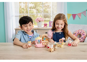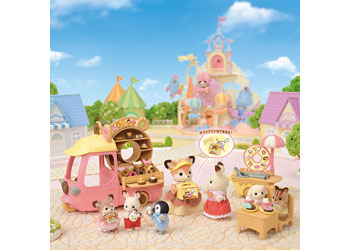 The Dip Dip Donuts Wagon includes the wagon, a fryer and a figure. The donuts can be fried, and toppings added! Along with the colorful donuts, there are various other adorable accessories-more than 30 in total! The owner, the Deer mother, wears a uniform with a donut motif. The donut wagon can be switched between a shop and a bus that seats four babies! The table, chairs and accessories can be stored in the bed of the wagon. Connect the fryer to the donut wagon and drive the wagon around with the fryer on board.