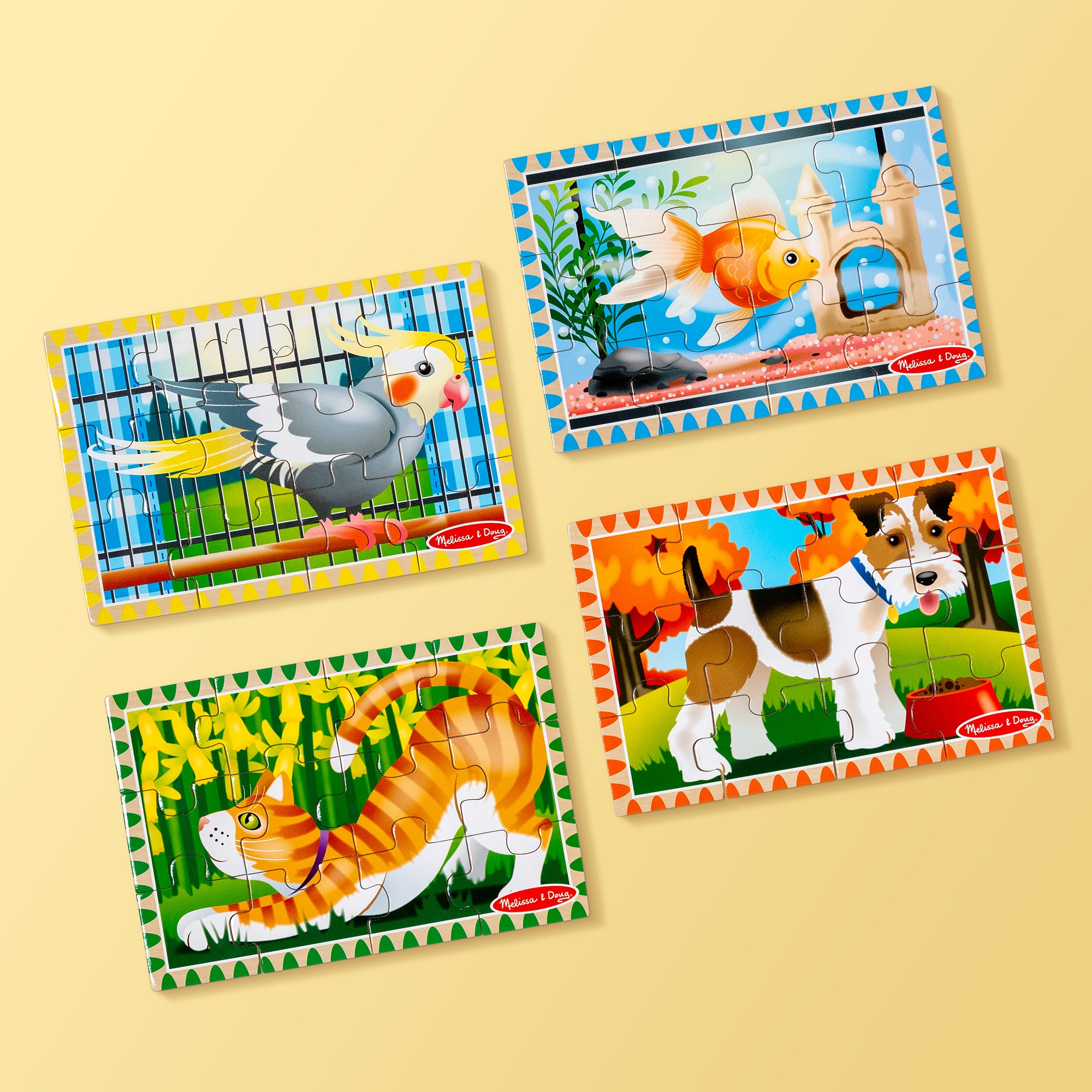 Set includes four wooden, 12-piece pet jigsaw puzzles-- a fish, a dog, a cat and a bird-- each stored in a separate compartment of a sturdy wooden box! The slide-on box lid doubles as a convenient puzzle board! Each puzzle piece is shape-coded on the back for easy sorting. Great for travel!