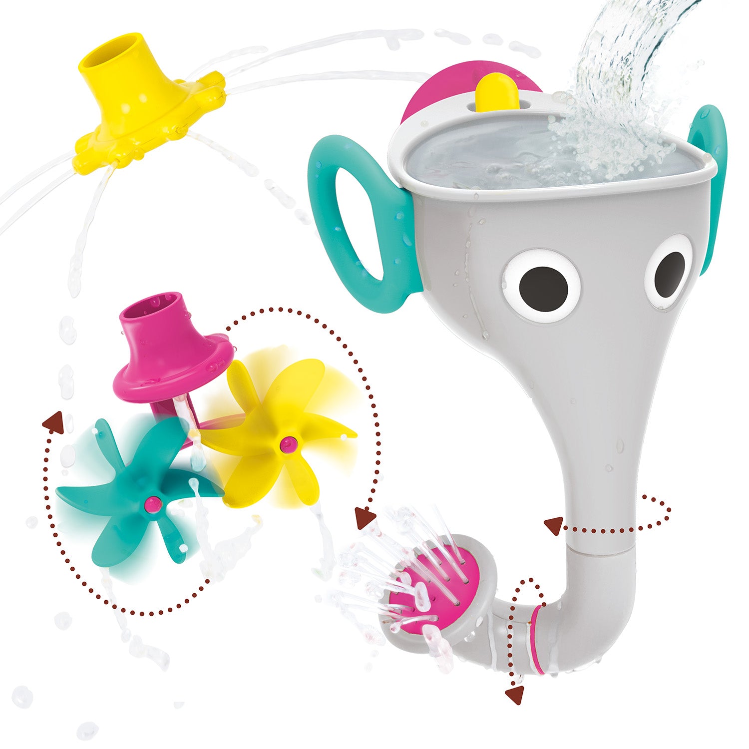 Attach one of the three interchangeable trunk accessories – the spinning water mills, a twistable trunk that sprays, or the sprinkler nozzle.