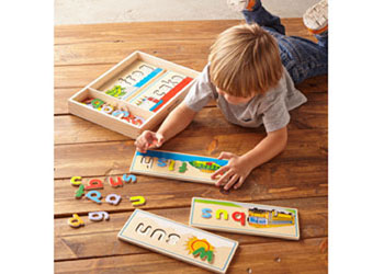 Complete a puzzle to spell a word, while developing a sight-reading vocabulary or use the letters for stencilling. 72 colourful wooden letters fit into the 8 two-sided cut-out boards to spell three and four letter words. Fits into one compact wooden storage case!