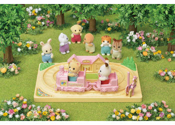 A playground with moveable train for little ones to enjoy. It includes a moveable railroad crossing gate and Jason Petite Bear Baby figure. This fun train set can move along the train tracks with a gentle push, but don' forget to stop at the railroad crossing gate.Set it up with Baby Castle Nursery to create a large school scene complete with a garden (sold separately).Set includes Jason Petite Baby Bear figure, Station, Railway, Train, Passenger Cart, Connector, Crossing Gate, Crossing Signal (a total of 8 pieces)