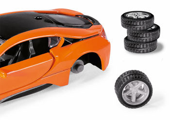 Sports car with patented door openingEven when parked, the BMW i8 attracts attention. The big show is climbing into the hybrid sports car. The wide carbon fibre doors swing upwards and forwards at the sides. Just like the original, the siku car in 1:50 scale opens realistically. siku is making the coup out of metal.