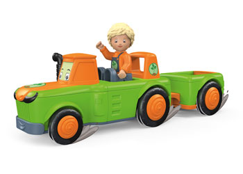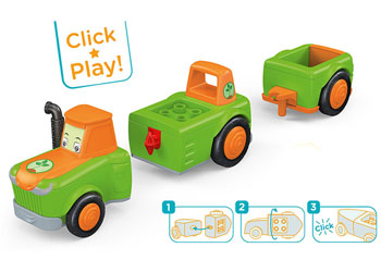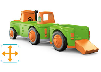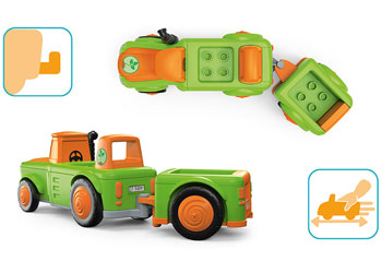Cock-a-doodle-doo! At dawn, Frank and the vibrant orange-green Farmy begin their day with the rooster's call, immediately attending to the farm’s essential tasks. From tilling fields and gathering hay to checking fences and feeding animals, there’s always work to be done. After loading fresh straw bales onto Farmy’s trailer, Frank cleans the animal pens and spreads new bedding. As the sun rises, he distributes feed before taking a well-earned breakfast break to prepare for the next round of chores. This high-quality Toddys toy, suitable for children aged 24 months and up, features a friction motor to support fine motor skills, patience, and engaging play. Frank’s figure has movable head, arms, and legs, while Farmy separates into three parts and connects with other Toddys vehicles, incorporating a trailer with an opening lid to enhance imaginative play. Compatible with other brands and built to last with the siku Click and Play® twist-and-push system, this robust set encourages creative, skill-building fun.